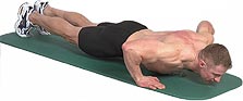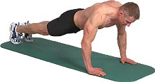 ![]() | Необходимое Оборудование: Упражнения выполняются на мягкой подстилке для занятий на полу. Исходное положение: На животе, голова смотрит вниз, руки на ширине плеч. Поместите ваши руки в высоту ваших плеч с расстоянием локтей на каждой стороне. Ладонь лежит на полу всей поверхностью, пальцы смотрят вперед или слегка внутрь. Локти немного разведены в стороны. Ноги касаются пола только носками. Это исходное положение, при котором спина, ноги и кисти параллельны. Немного выровняйте руки, чтобы корпус был на расстоянии одной руки от земли. Выполнение упражнения: Тело толкаете вверх, выравнивая руки пока последние не будут практичекси ровными. Полностью выравнивать руки не надо, т.к. расслабляются мыщцы груди. Затем вернитесь в исходное положение. Альтернатива: Вместо упора носками разогнутых ног новички могут стать на колени под углом 90 ° - это облегчит упражнение. Задейстованные мышцы: M. pectoralis major M. deltoideus M. triceps brachii | |