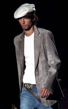 Дизайнер Дома моды Gucci Том Форд (Tom Ford) увидел мужчину нового сезона в образе мачо. По сравнению с прошлым сезоном, когда мужчина Gucci был рок- или порно-звездой, эта коллекция значительно более спокойная и консервативная. Очевидно, что источником вдохновения для дизайнера стали киногерои в исполнении Марлона Брандо (Marlon Brando) – на подиум вышли модели в черных кожаных куртках, полинявших джинсах, черных кожаных кепках и сдвинутых на бок поясах.