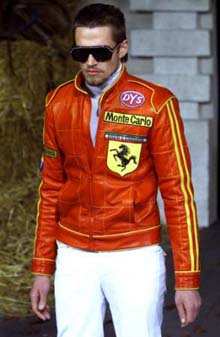 На суд зрителей было представлено около двадцати ансамблей – преобладали широкие брюки, шелковые рубашки и одноцветные шелковые галстуки с броскими галстучными булавками. Кстати, изображение вставшей на дыбы черной лошади – символ Ferrari – появлялось практически повсеместно – на красных стеганых гоночных куртках, свитерах, блестящих галстучных булавках.